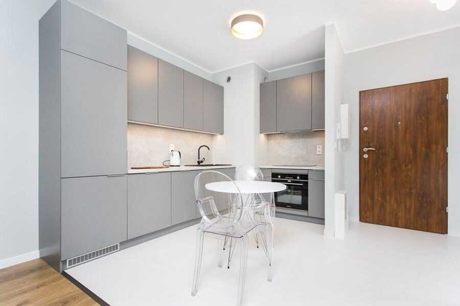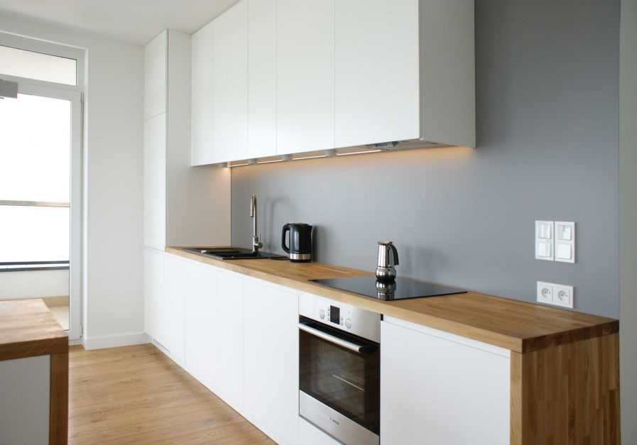 - У свободной стены. Если в кухне есть не занятая стена, то сюда отлично впишется прямая модель.