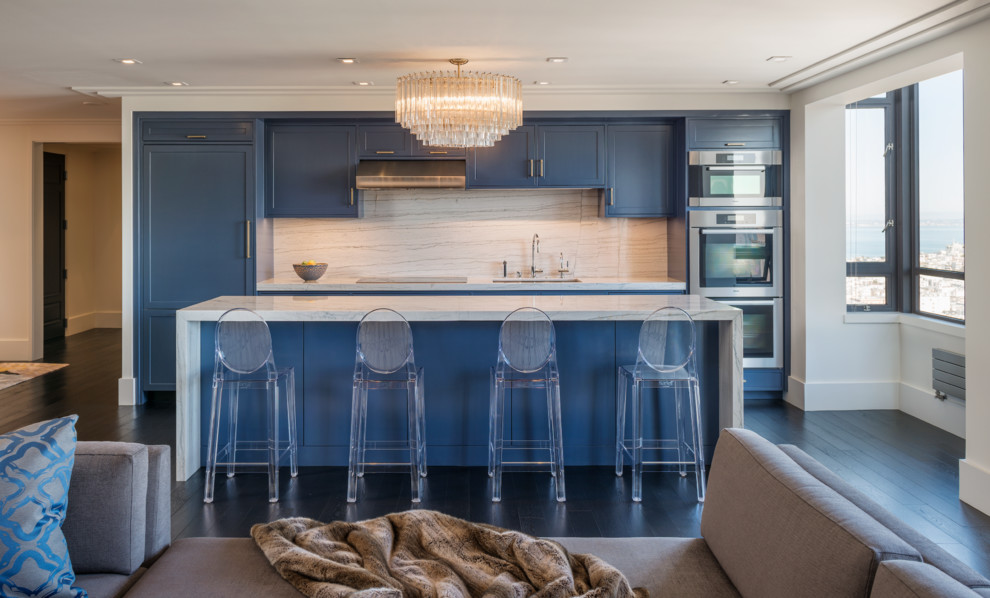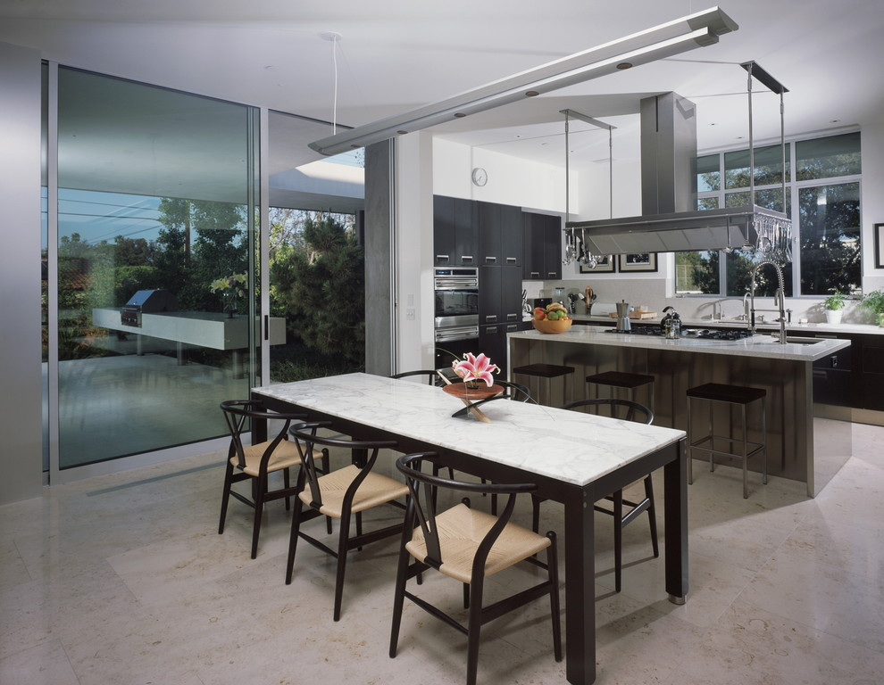 Современная кухня со стеклянным фартуком и столешницей из литьевого оникса выглядит эффектно