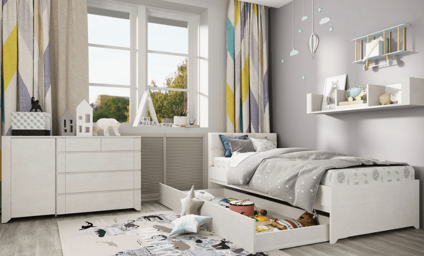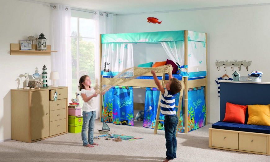 Оптимально, выполнить отделку, используя нейтральные оттенки, подходящие для разного возраста, а яркость привнести текстилем, шторами, коврами, которые потом легко сменить без серьезных затрат. Делать капитальный ремонт не потребуется, достаточно с помощью разных вещей и предметов просто менять дизайн, опираясь на возраст и новые увлечения ребенка.