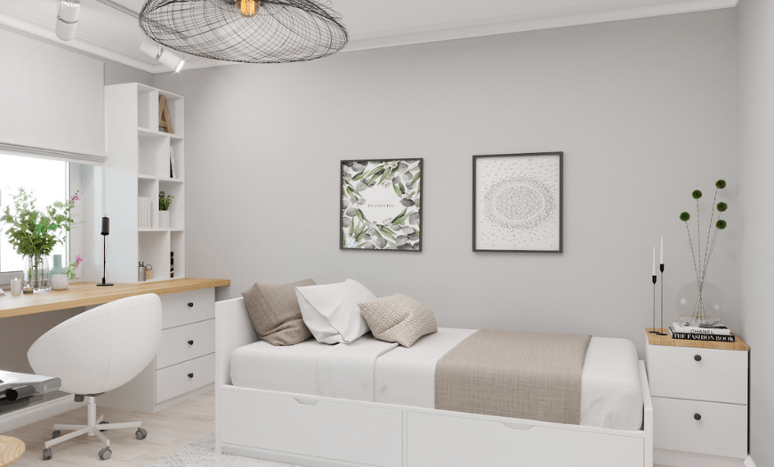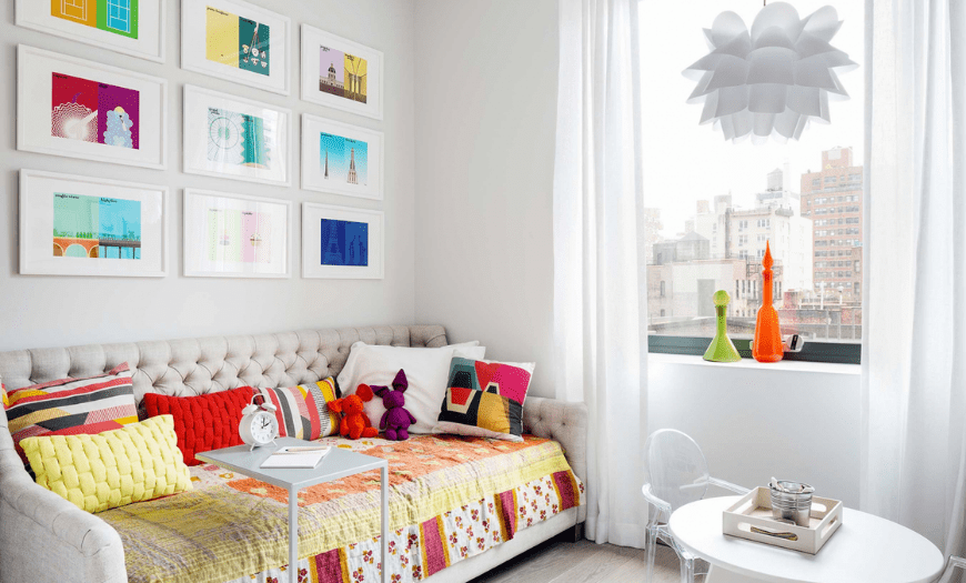 В этой ситуации стоит обратить внимание на светлые оттенки. Если обои однотонные, то для них подойдет яркий текстиль с большими геометрическими узорами и абстракцией