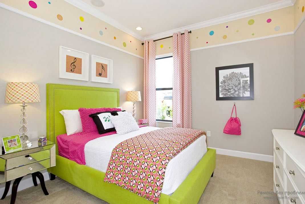 Для медлительных, неактивных девочек подойдет желто-зеленая гамма. Желтый бодрит и побуждает к деятельности, тонизирует и возмещает недостаток солнечного света в комнате. А уравновесит его зеленый, который снимает напряжение и усталость. Но так как преобладание одного яркого цвета нежелательно для интерьера юной девушки, лучше его разбавить гармонично сочетающимися красками: зелеными, бежевыми, белыми.