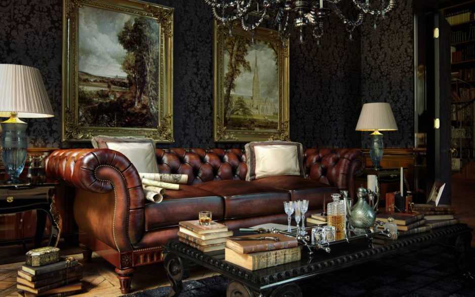 Что касается темных оттенков, а также ярких акцентных тонов, то в старинном английском интерьере они допустимы лишь в некоторых частях гостиной комнаты. Лучше, если это будет зона с камином или центральным диваном.