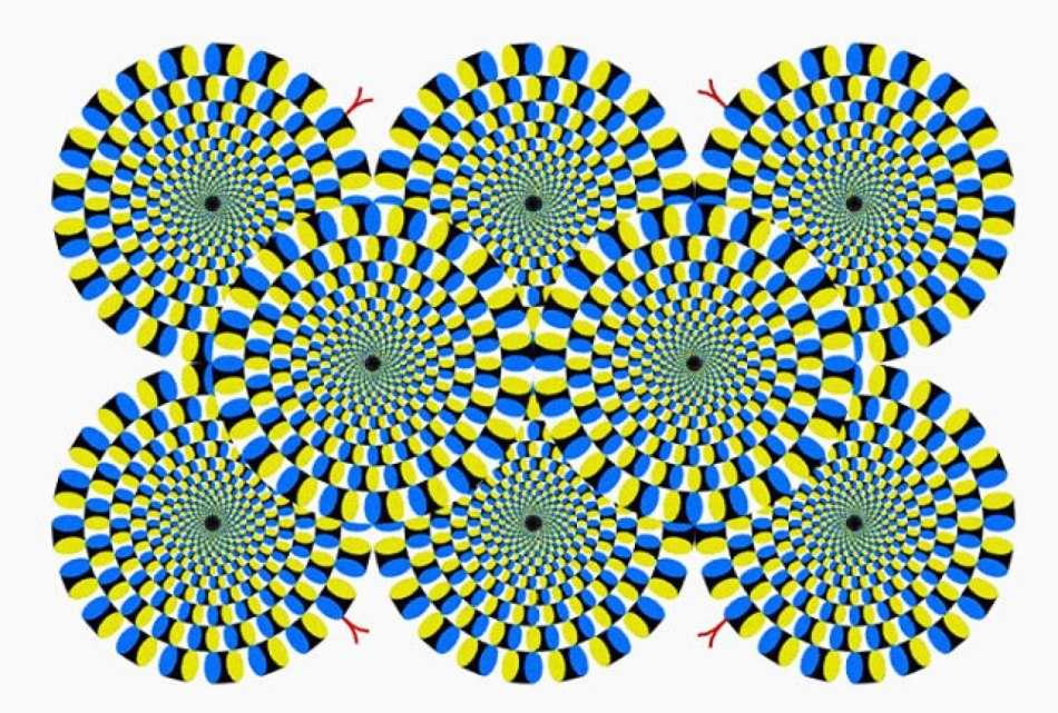 Благодаря контрастному изображению круглых дисков, создается ощущение, что они двигаются в разные стороны: по часовой стрелке и против нее.