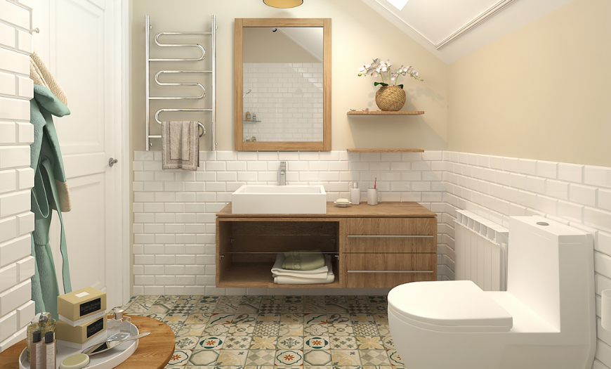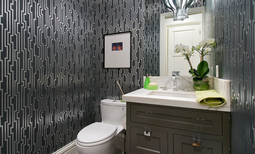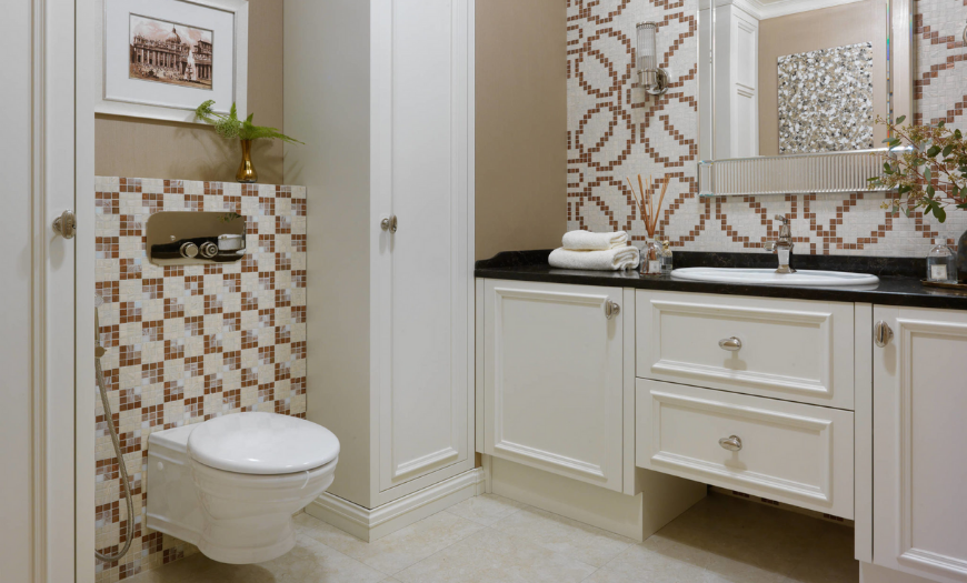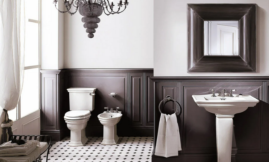 В таком стиле преобладают квадратные формы, угловая сантехника и мебель. Стены и пол украшены геометрическими узорами. Допускается наличие обоев и окрашенных поверхностей.