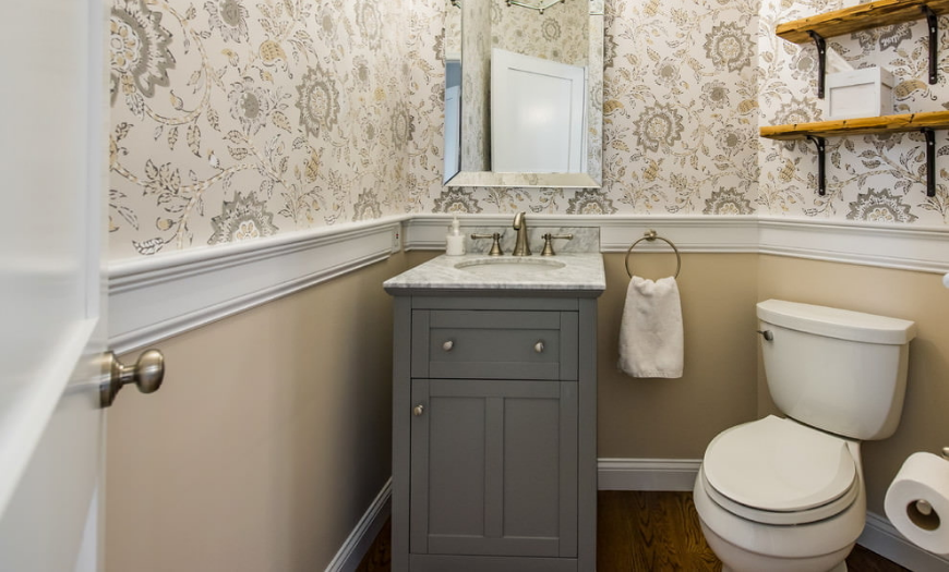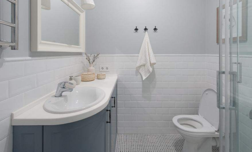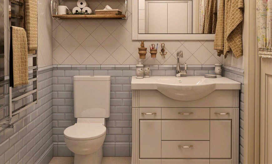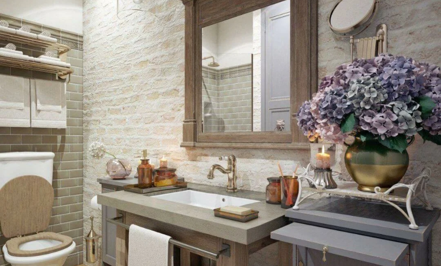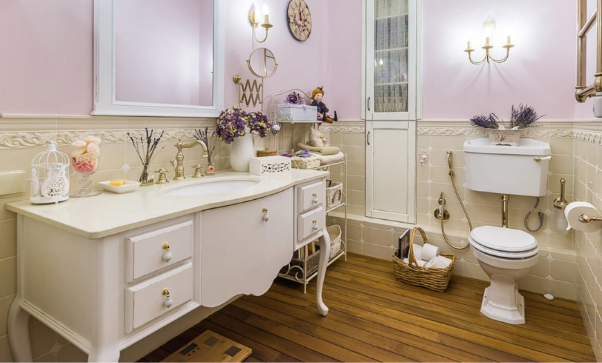 Такой стиль применяется в больших санузлах, где есть место для мебели, декоративных элементов и текстиля. Пастельные оттенки в сочетании с растительными узорами создают ощущение легкости и тепла. Столик или шкаф из натурального дерева светлых тонов, полотенца из льняной или хлопковой ткани, цветочные горшки и ковры на полу – все это атрибуты прованса.