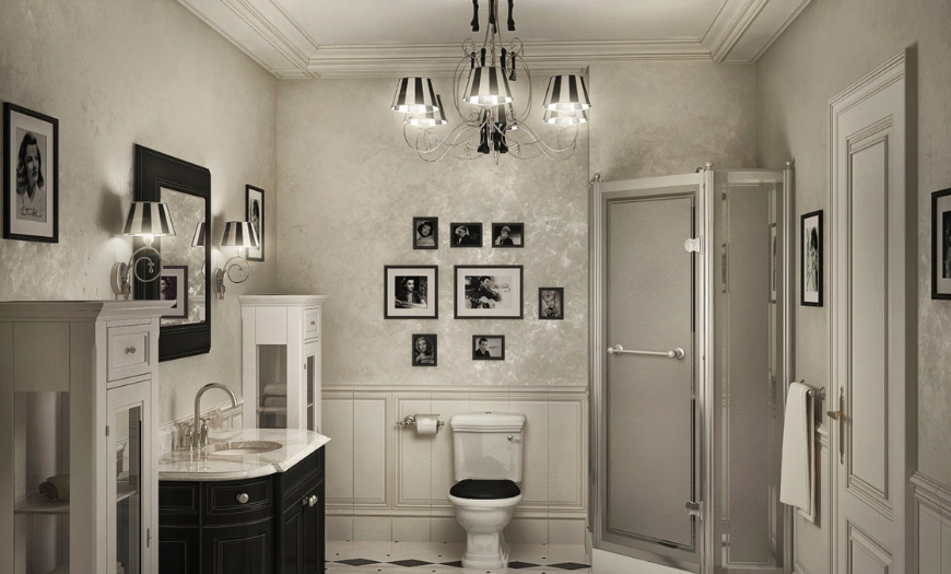 Ванная в стиле ар-деко объединяет в себе элегантность, гламур и роскошь. Доминирующими цветами выступают контрастные черный и белый, однако могут присутствовать и другие оттенки: