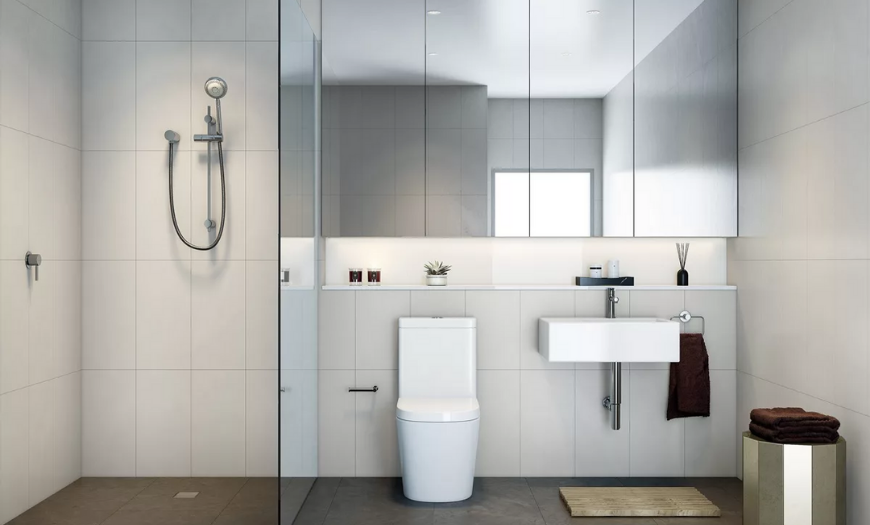 Другой вариант расположения сантехники — вдоль длинной стены унитаз и биде, раковина — в углу