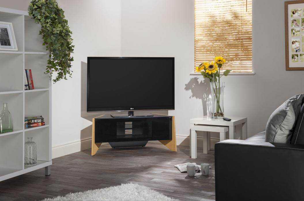Угловая тумба в гостиную идеально подойдет, если габариты помещения небольшие, она позволит разместить диван и телевизор по противоположным углам, как и советуют дизайнеры интерьера.