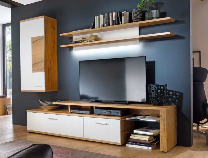 Превосходно смотрится тумба в одной цветовой палитре, что и стенка со шкафом. Производители предлагают модульные подставки в различных оттенках. Можно подобрать белые, черные модели. А также хороший вариант – цветовая палитра под дерево. Часто используется древесина венге и орех. Такие модели комбинируются с расцветками беленого дуба или оливы.