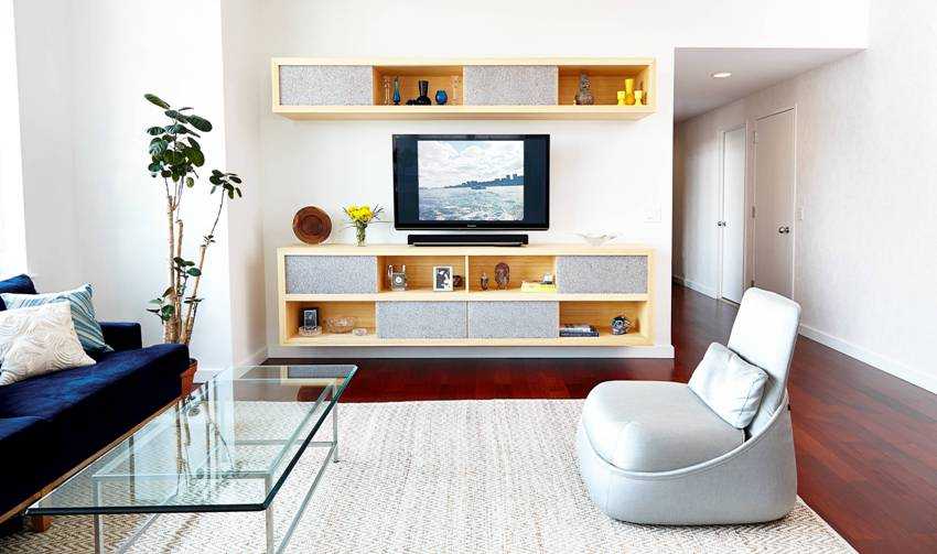 Важно, чтобы монтаж подвесной мебели выполнялся качественно, иначе она не выдержит нагрузки. Подвесные тумбы под телевизор в гостиную обычно устанавливают на несущую стену, так как тонкие перегородки не могут обеспечить надежное крепление