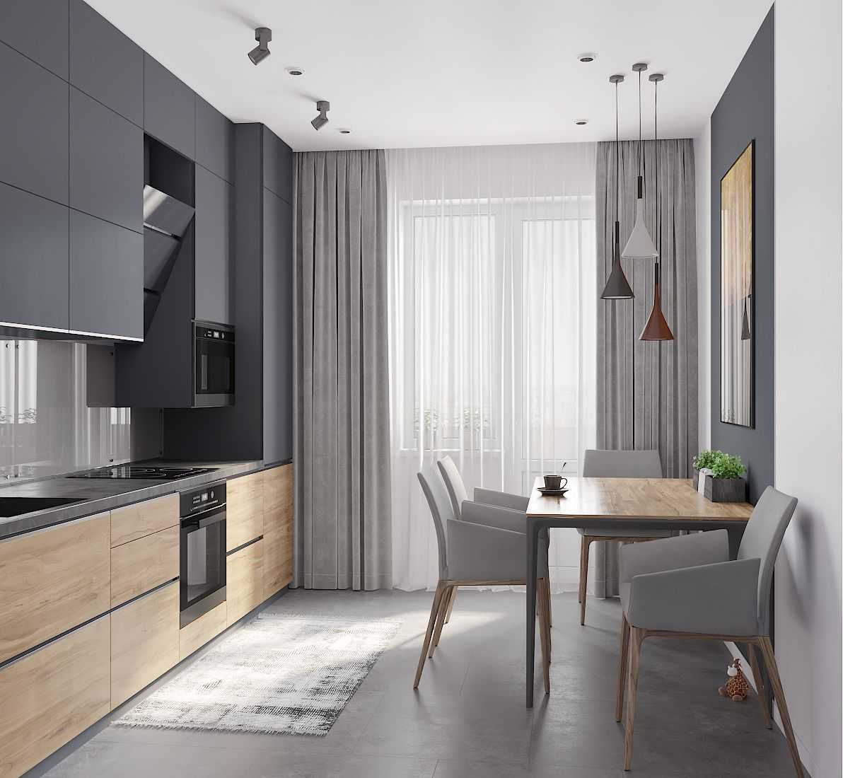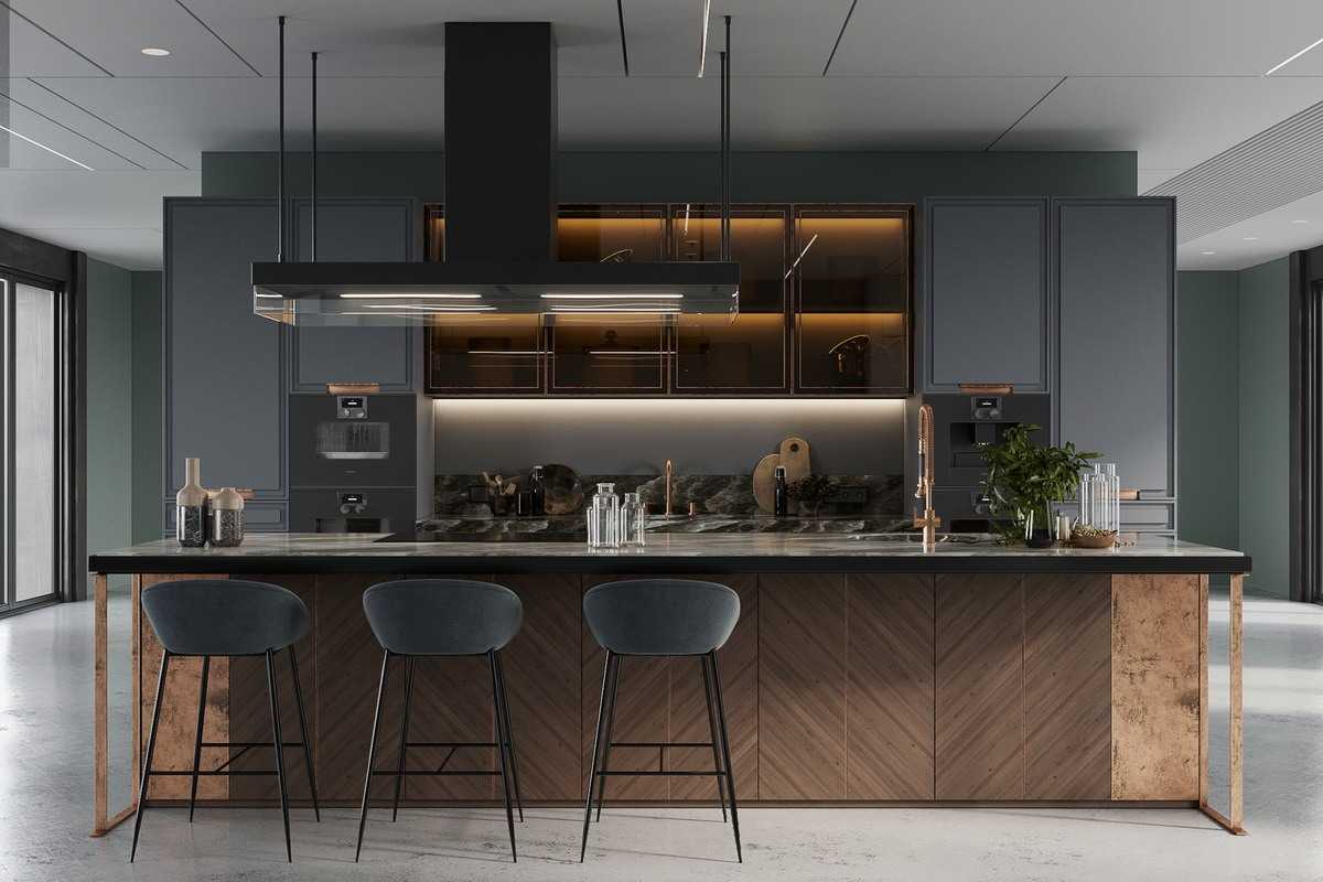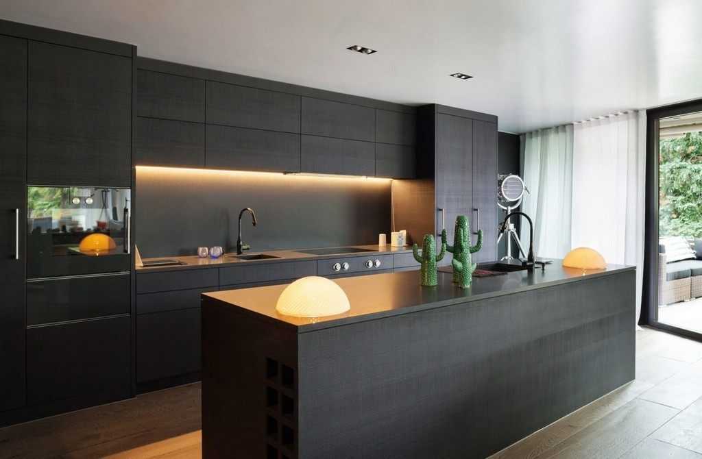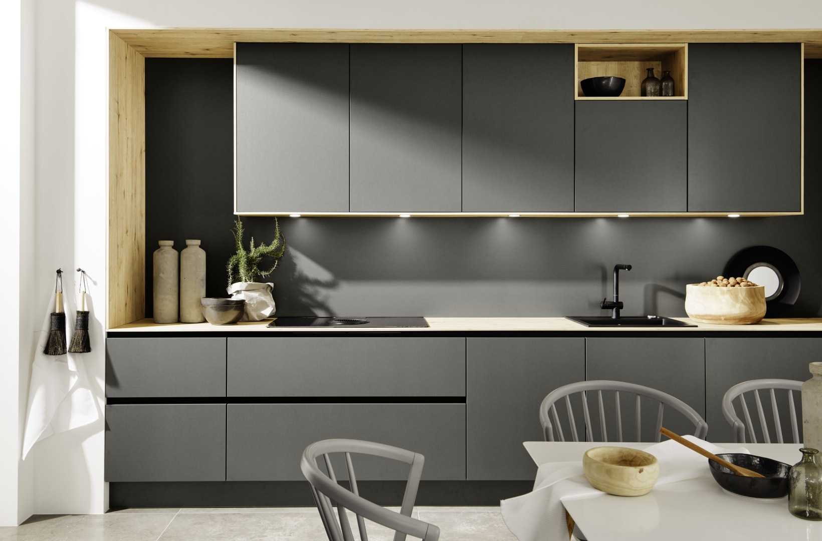 Тренды кухонь 2021 – 2022 часто представлены дизайнами в стиле модерн. Он практичный, функциональный, лаконичный. Он отличается от других контрастными цветами, строгими линиями, деревянной мебелью с металлическими, стеклянными деталями. Техника встроена в гарнитур, светильники — в потолок или мебель. Поверхности могут быть глянцевыми или матовыми.