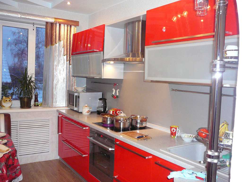 Это довольно смелое решение. Сочетание стали и алого встречается довольно часто, в стиле хай-тек и минимализм. В таком интерьере должны лидировать серые оттенки. Чем меньше помещение, тем меньше красных элементов в ней должно быть . Мебель может в некоторых местах быть с вставками красного или техника с красным корпусом и черной обводкой. Хотя может быть наоборот, когда доминирует красный цвет. Замечательно сочетаются, малиновый, бежевый и теплые серые тона. Красиво смотрится, когда нижняя часть кухонного гарнитура серая, а верхняя красная.