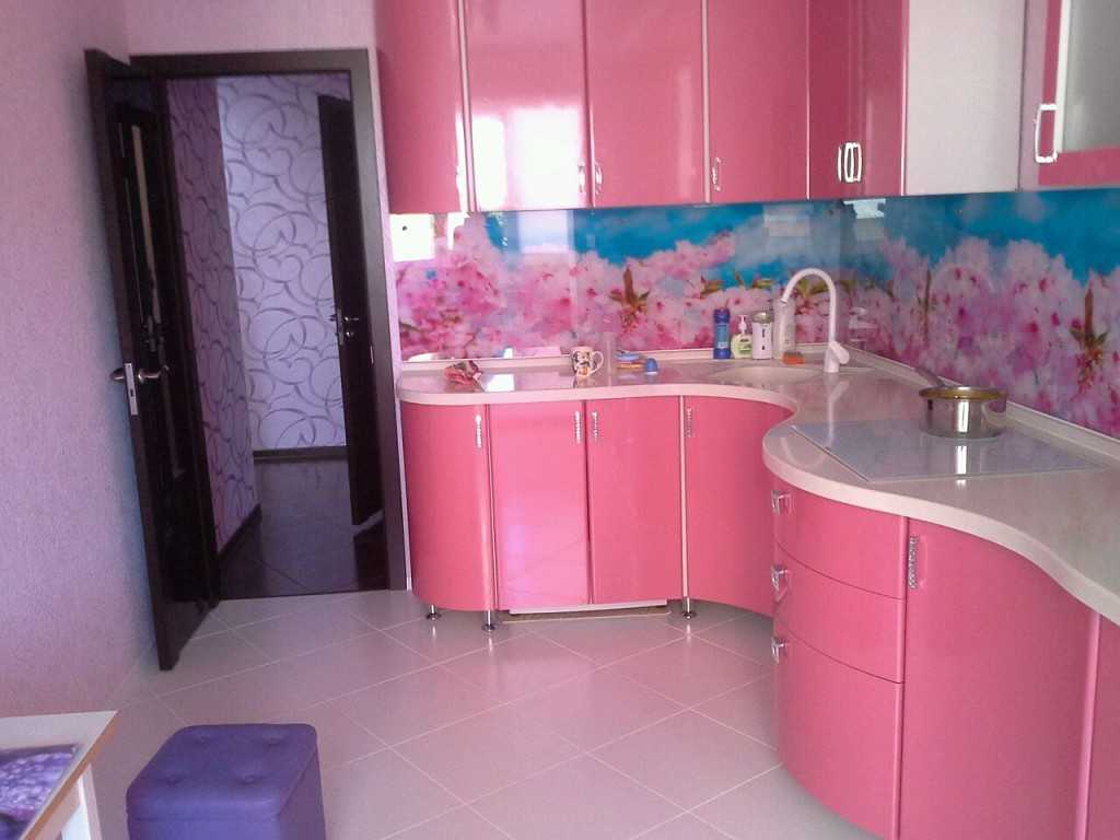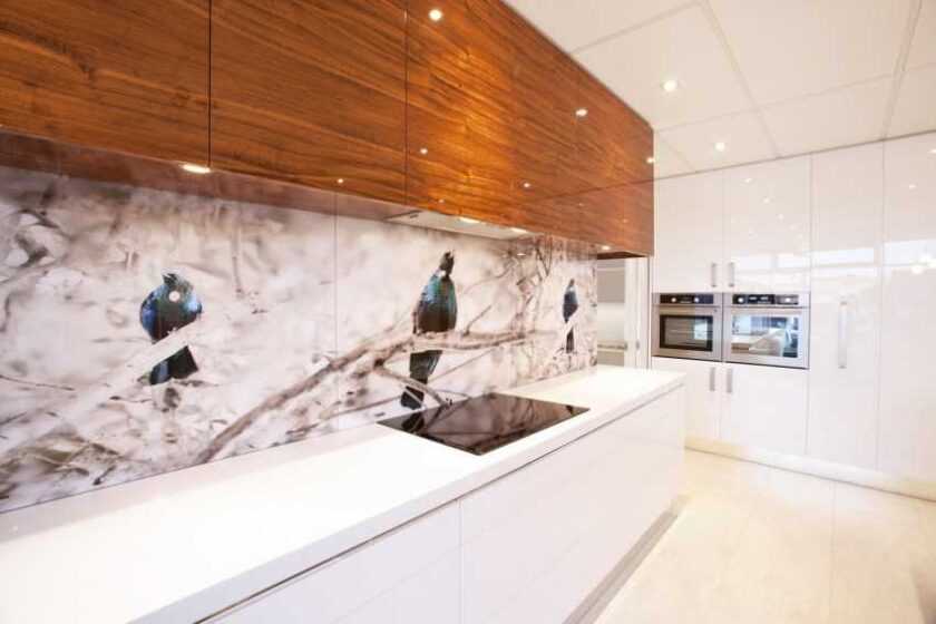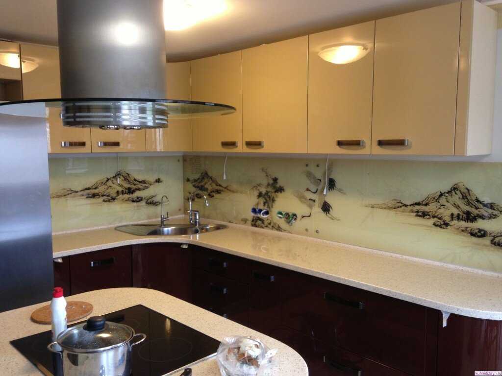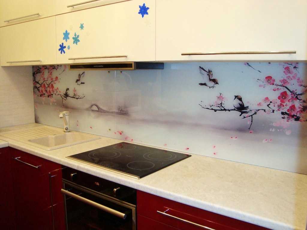 Такие панели называются «скинали». На изнаночную поверхность стекла наносится любое изображение, которое нравится владельцу кухни, делается это с помощью особой технологии. Специальные чернила, используемые в данном процессе, не выгорают на солнце, не боятся повышенной влажности и спокойно выдерживают температуру до 120 градусов. Недостаток такой панели всего один — рисунок может быстро надоесть, и тогда придется полностью переустанавливать кухонный фартук.