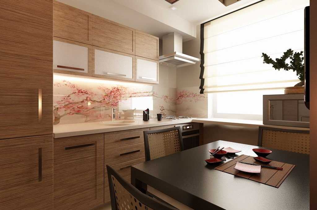 Японский. Стиль предполагает большое количество свободного места, отсутствие ярких акцентов и минимальное количество элементов декора. Фартуком в пастельных тонах можно легко обыграть главные принципы этого направления.