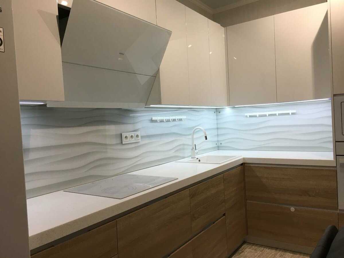 Стеклянный кухонный фартук как никакой другой сочетается с любой подсветкой.