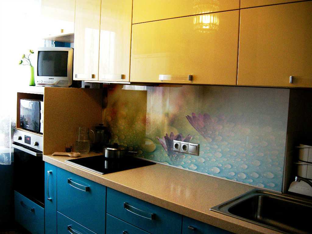 Красивый яркий фартук для кухни с использованием стеклянных скинали