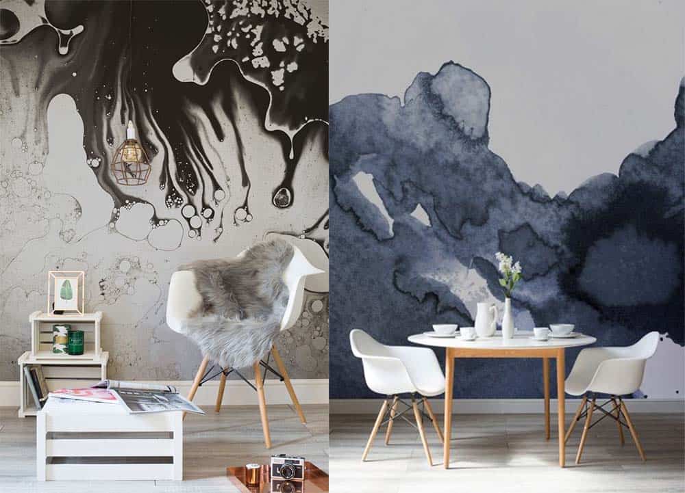 Впечатляющие обои, напоминающие абстрактное произведение искусства, привлекут внимание, даже если на стенах нет картин! В тренде абстрактные пятна, напоминающие чем-то разводы масла на воде или акварели. Отлично смотрятся как с минималистичной, так и экстравагантной мебелью и декором