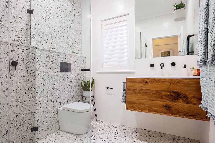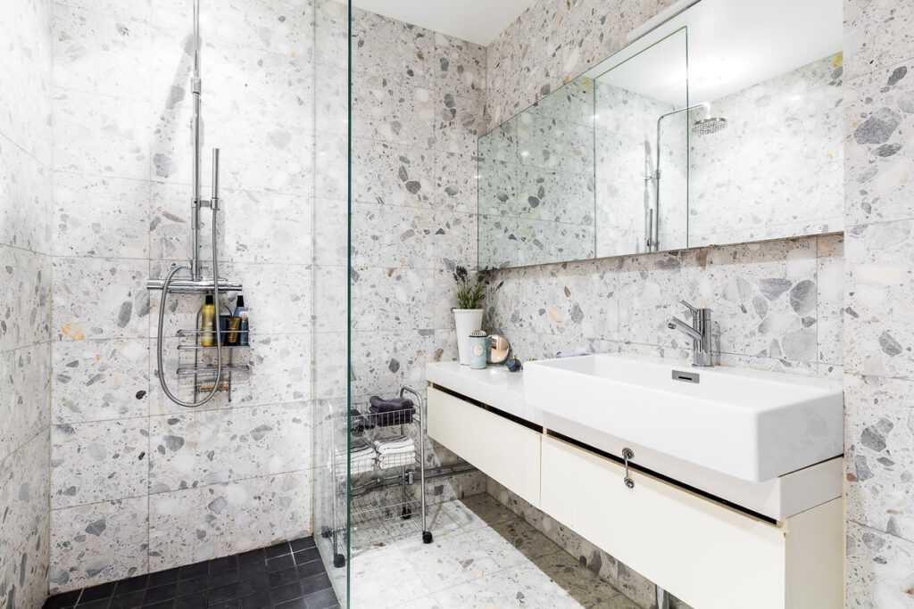 Помимо классического терраццо, то есть из мрамора, кварца или гранита, они также представили, среди прочего, плитку с прозрачным стеклом, так со стеклянной стружкой. Более того, терраццо используется не только в качестве стеновых или напольных панелей, но и как отличный материал для умывальников, столешниц и аксессуаров для ванных комнат.