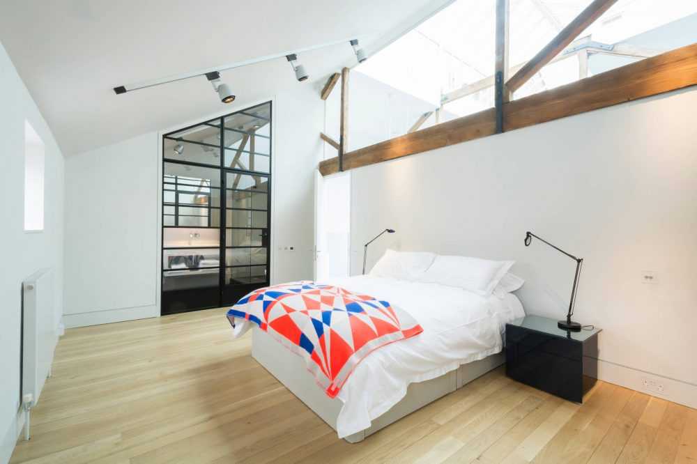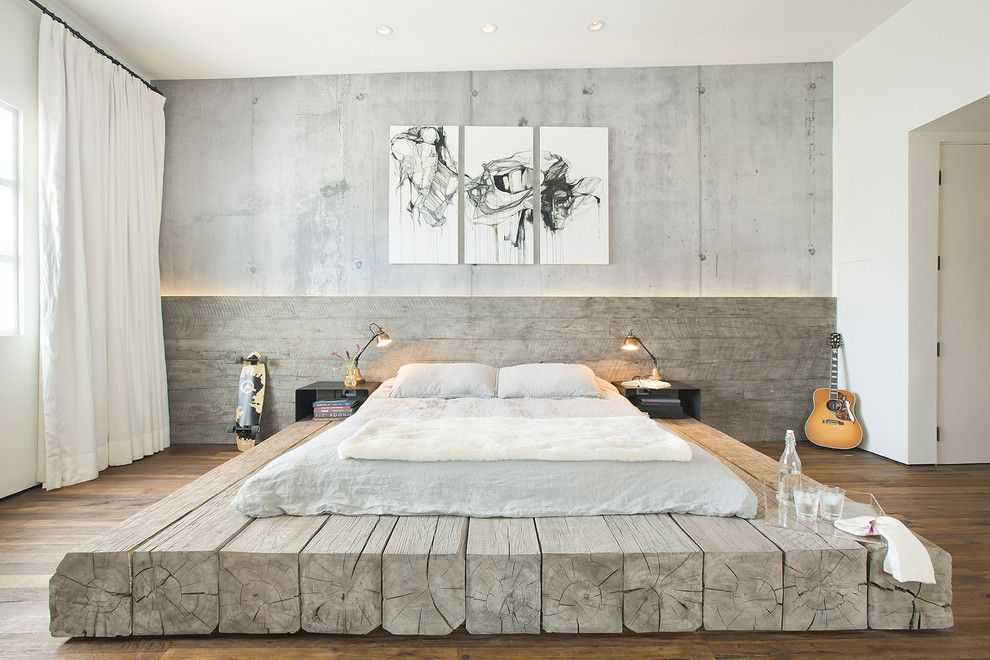 Создание спальни в стиле лофт предусматривает покрытие стен грубой штукатуркой или наличие кирпичной кладки. Подобный интерьер основан на контрасте холодных цветов и фактур, самодельных и оригинальных элементах декора, наличия больших высоких оконных проемов и максимальном свободном пространстве. Для отделки потолка оптимально подойдет серая доска и покраска в белый цвет.