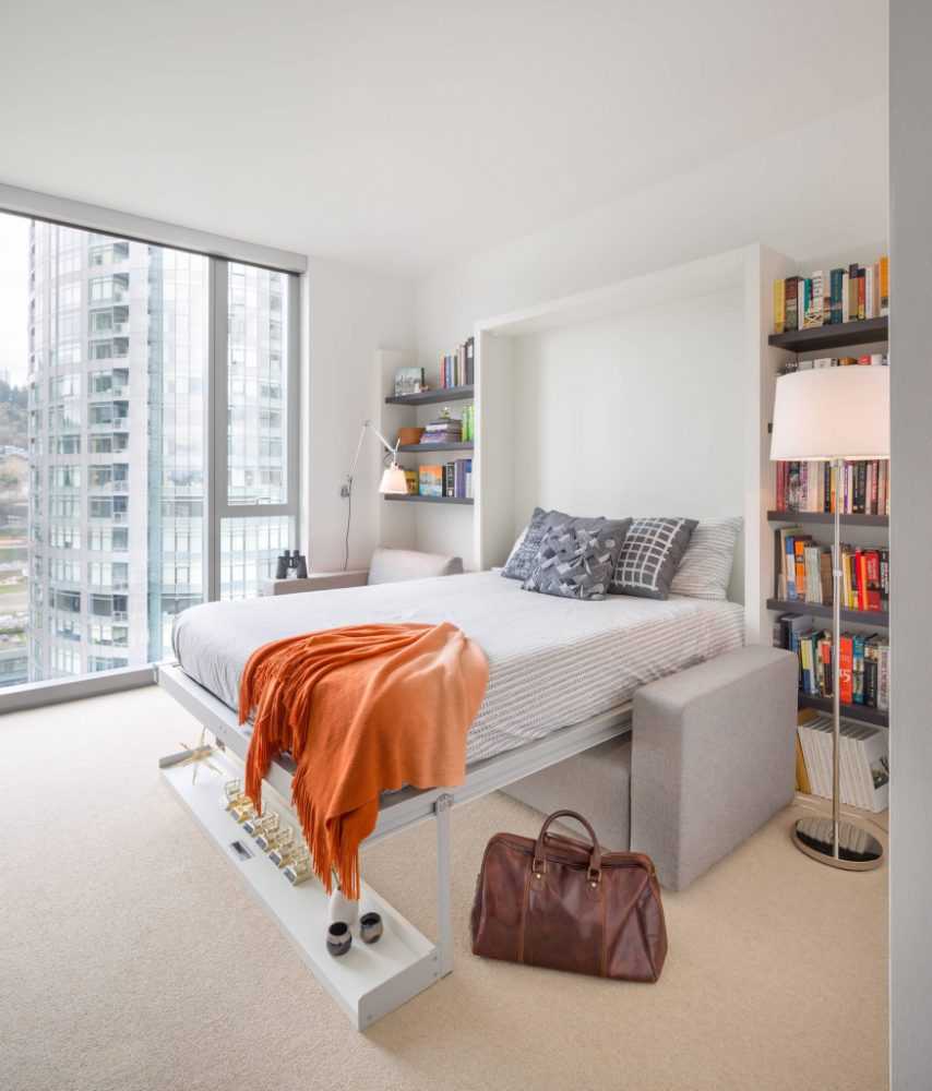 Маленькая спальня часто одновременно выполняет несколько задач. Это место для сна и гардеробная, либо рабочий кабинет, кинозал. Для экономии площади специалисты рекомендуют использовать многофункциональную мебель и убирать лишние предметы. Старайтесь не закрывать стены. Избегайтесь гарнитуров с закругленными формами.