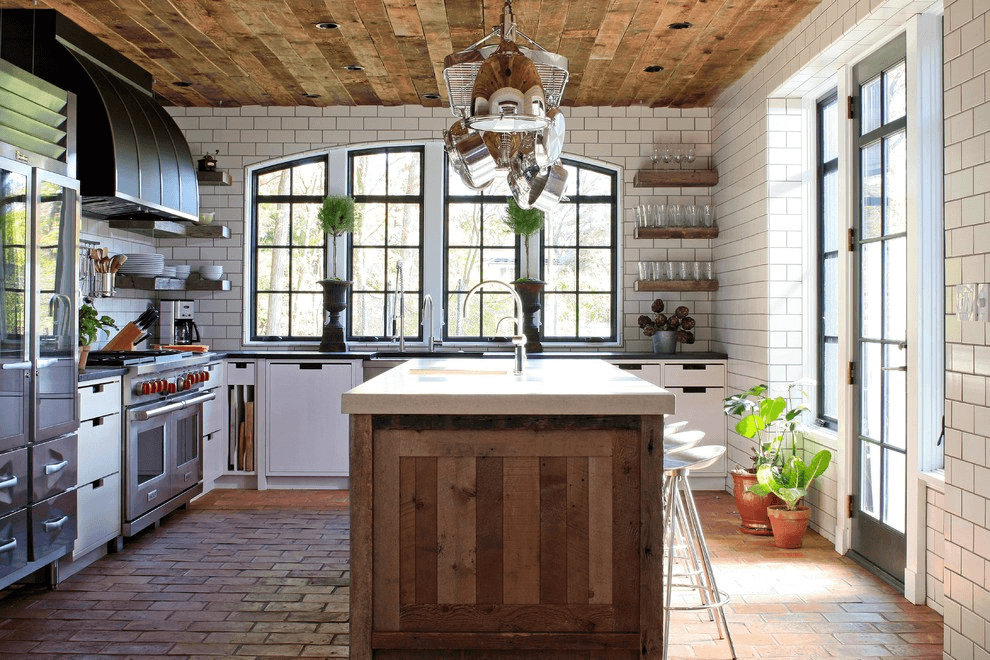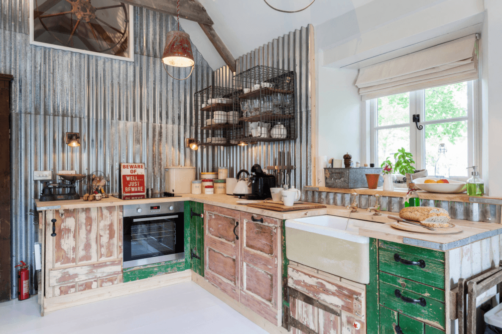 Гармоничное сочетание старой доски и металла в интерьере кухни