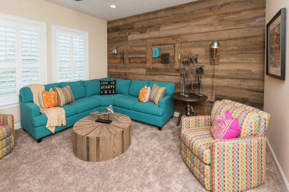 Пространство позади дивана не будет выглядеть пустым, если заполнить его ажурной перегородкой, выполненной из реек и брусков. Милым украшением гостиной может стать небольшой столик, собранный из необработанных досок.