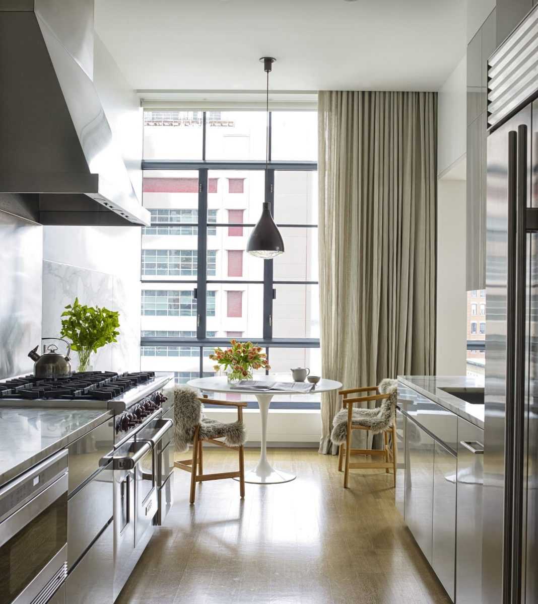 Современные шторы гармонично смотрятся со стальными хромированными поверхностями.