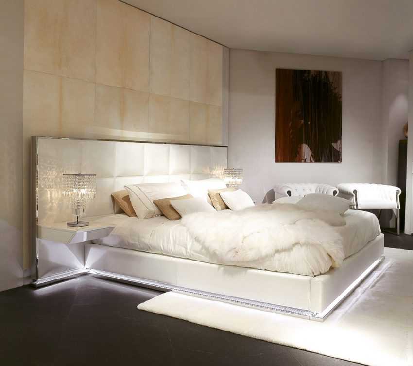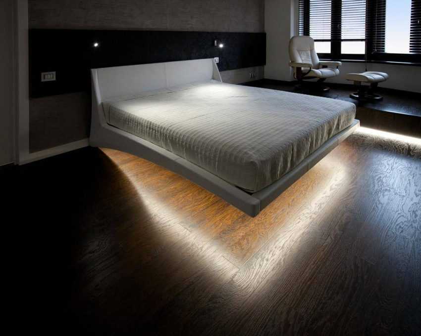 Обрамить эту деталь декора можно и при помощи светодиодной ленты, а по бокам расположить ночные светильники для спальни с неяркими лампочками. Холодные и яркие блики светодиодов в сочетании с мягким светом в спальне дадут интересный эффект.