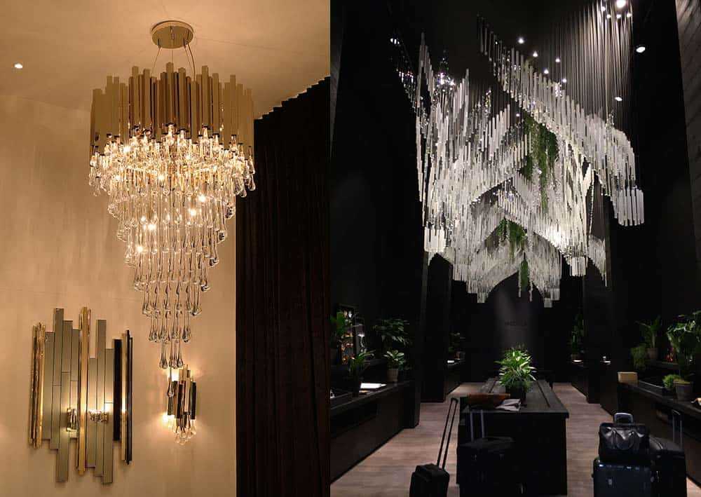 Огромные свисающие с потолка каскадные кристальные конструкции завораживают взор…