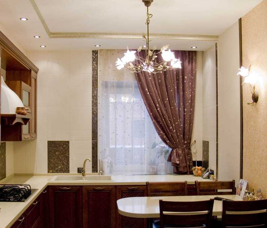 При низких потолках люстру повесить не удастся — будет мешать. Выход — найти светильник почти плоский. Можно квадратный или круглый — какой больше подходит под выбранный стиль оформления кухни.