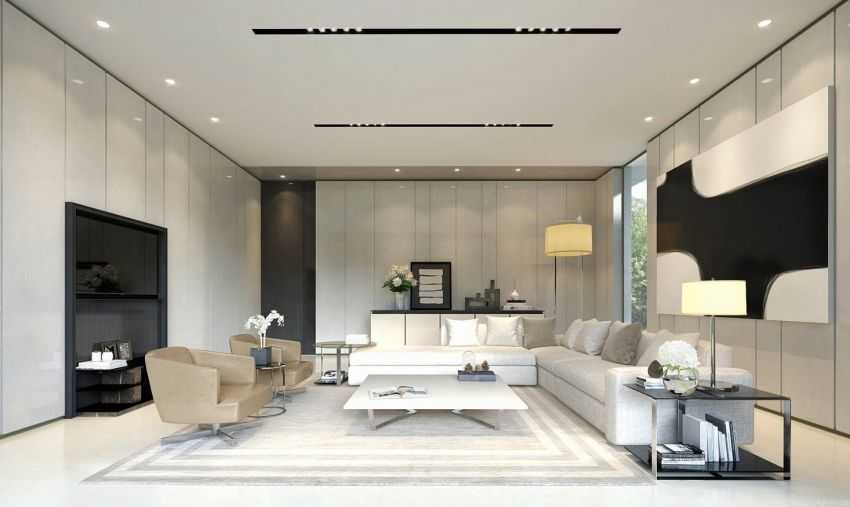 Это канонический вариант оформления гостиной, считающийся настоящим показателем современности интерьера, вне зависимости от календаря. В 2020-2021 году новые тенденции дизайна – именно в этой цветовой гамме.