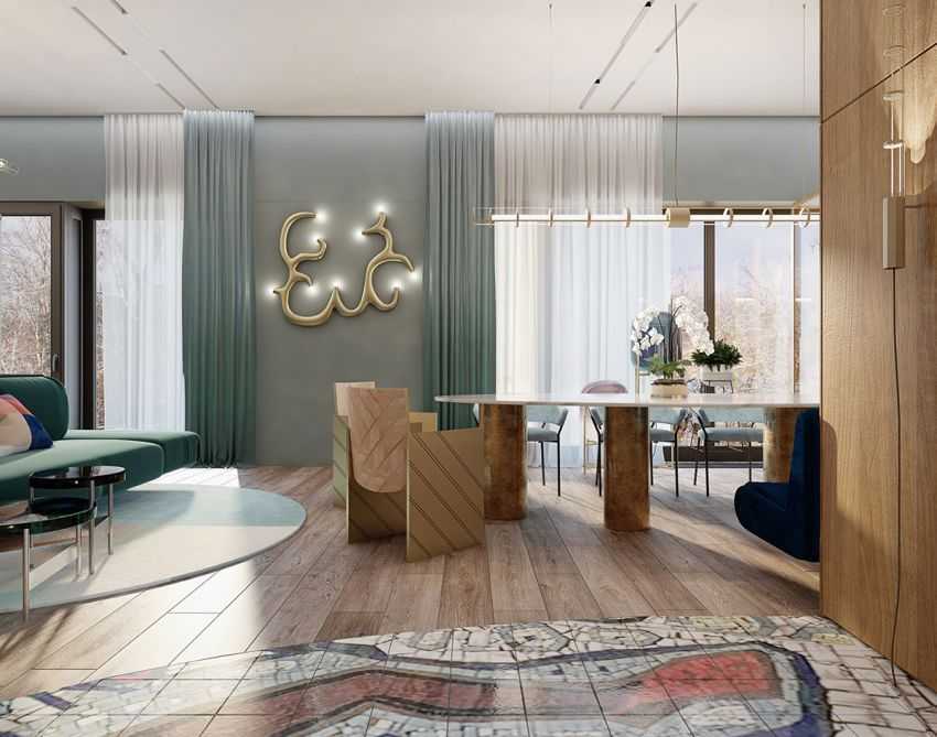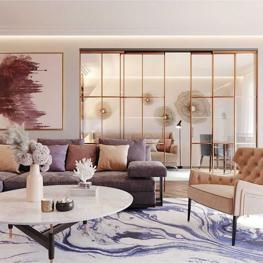 В интерьере гостиной 2020 года очень важно зонирование. В ней можно выделять зону для отдыха, маленькую столовую, кабинет и место для развлечений.
