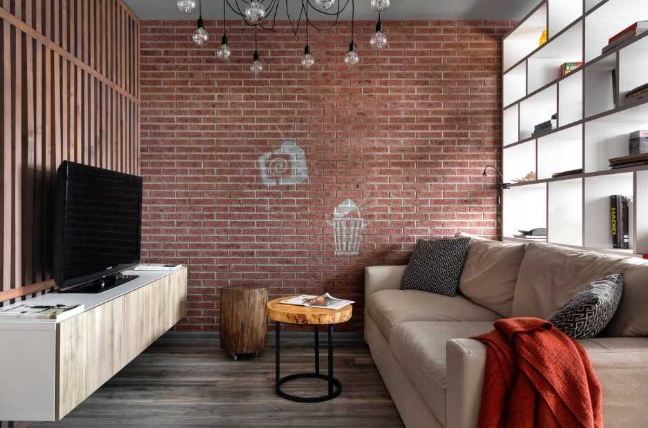 В подобную гостиную прекрасно впишется диван с обивкой из кожи или ткани с необычным принтом, а также небольшой мягкий ковер светлых оттенков.