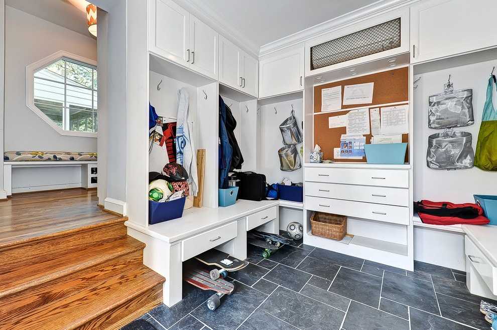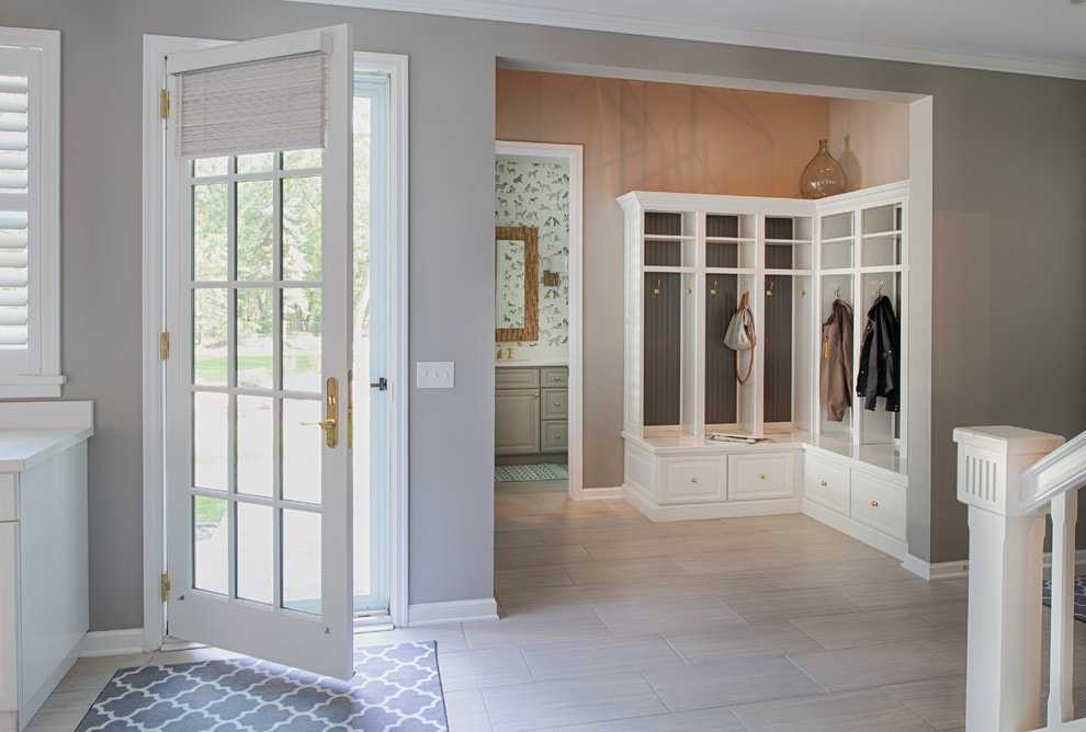 Прихожая частного дома в сером цвете с угловым шкафом