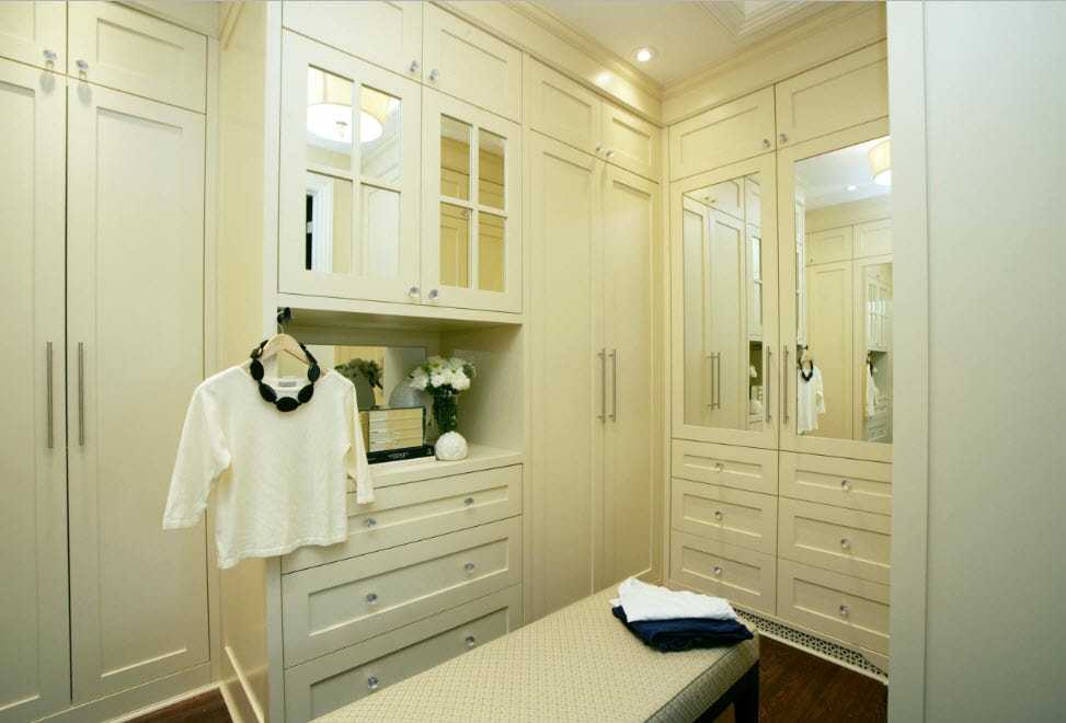 Если в комнате есть панели или молдинги, то дверцы мебели могут стать частью стены. Стоит подобрать ручки оригинальной формы, чтобы они выступали в качестве декора. Если в помещении есть ниша, то в нее просто встроить шкаф. Необходимо лишь, чтобы глубина его была не менее 40 см.