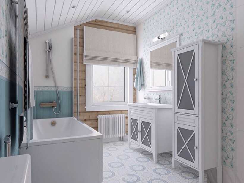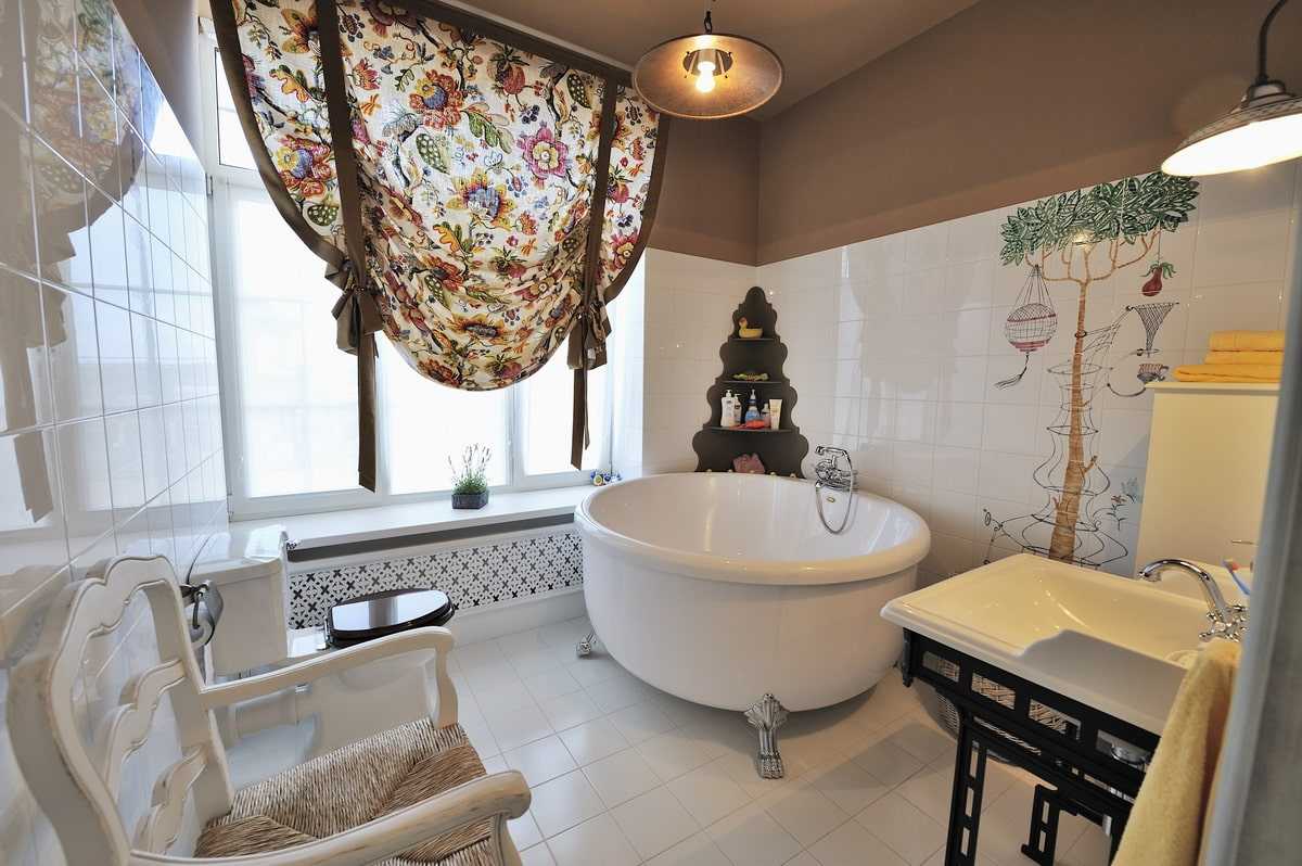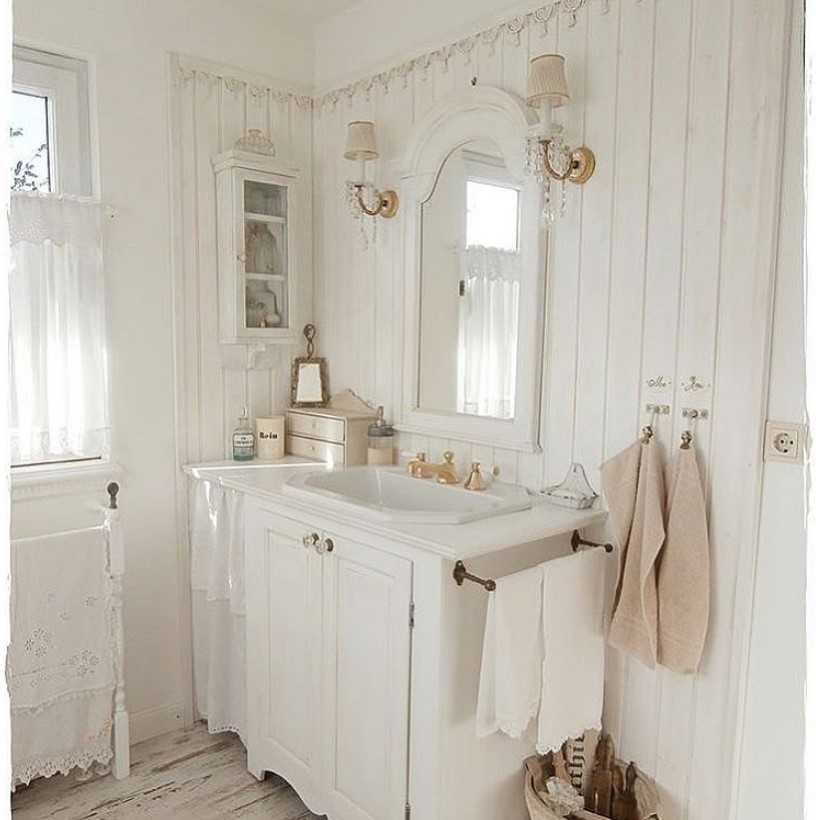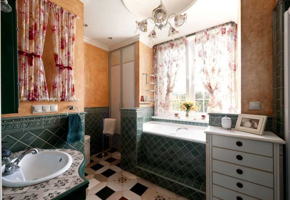 Если в помещении есть окно, то его обязательно должны украшать занавески. Подойдет легкий светлый тюль, накрахмаленные кружева, симпатичный ситец с мелким принтом, вышивка. Чтобы обеспечить приватность во время водных процедур, стоит повесить опускающиеся шторы из более плотных непрозрачных тканей. В остальное время они могут быть присобраны мягкой волной в верхней части окна на английский манер.