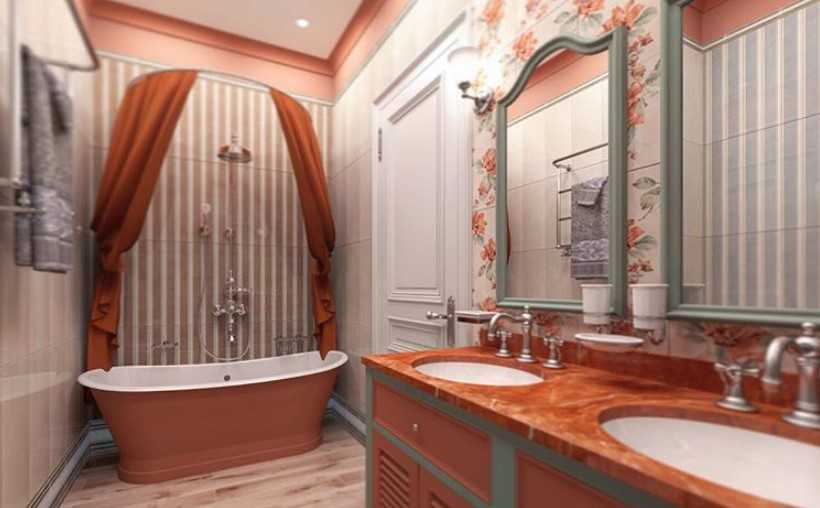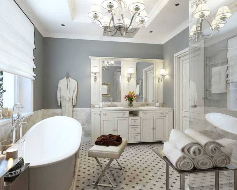 Традиционная ванная на ножках считается обязательным элементом. А вот о душевой кабинке лучше забыть. В остальном, наполнение комнаты может соответствовать потребностям владельцев.