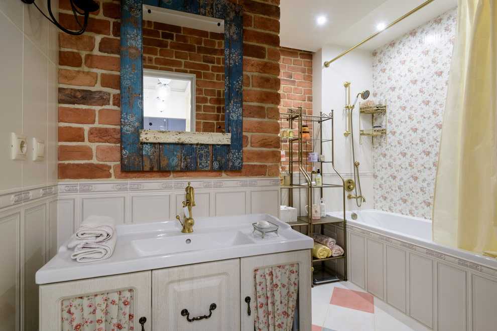 Каноничная ванная в стиле прованс — это произведение искусства. И если в других помещениях еще можно как-то разобраться с маленькой площадью, то здесь без свободного пространства просто не обойтись.