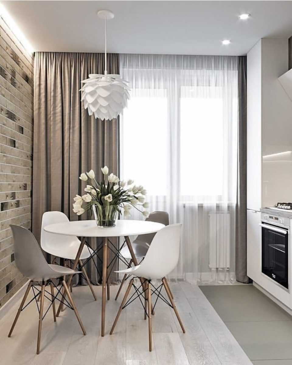 На маленькой кухне стоит отдать предпочтение современной классике или, так называемой, неоклассике. В этом случае лучше отказаться от многослойности, пышных и богато украшенных вариантов, а выбрать что-то более простое и сдержанное. Например, можно оставить всего один ламбрекен, если нет необходимости скрываться от яркого солнечного света, или повесить легкие гардины из тюля или органзы. Универсальным вариантом будут римские шторы однотонного дизайна или с неброским узором.