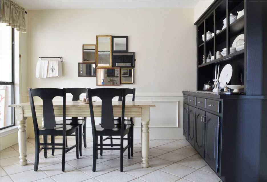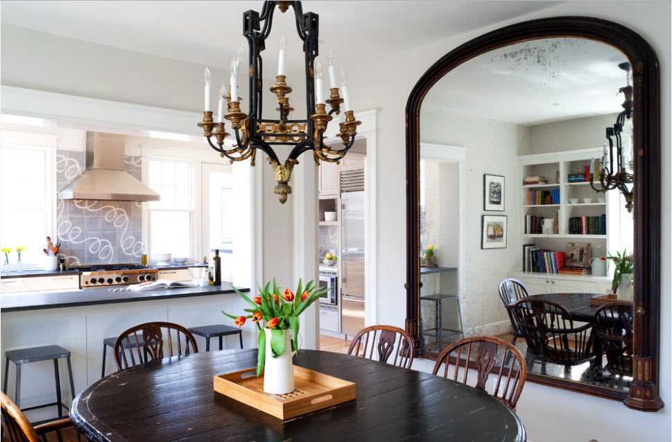 Пожалуй, самый классический вариант – повесить зеркало на одну из стен кухни. Такое решение скрасит традиционную “столовость” комнаты, сделает ее более изысканной и утонченной. Единственный момент, опять же – оптимальное расположение, которое будет зависеть от специфики быта хозяев. Об этом упоминалось выше.