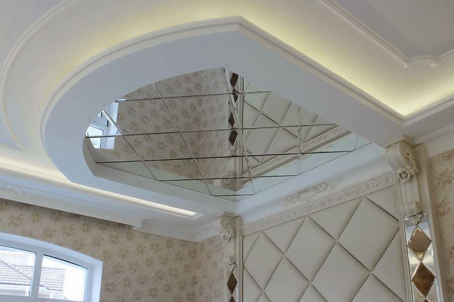 Но важно не переборщить: полностью зеркальный потолок создаёт эффект перевёрнутого пространства. Поэтому для отделки выбирается часть поверхности – центр или периметр.