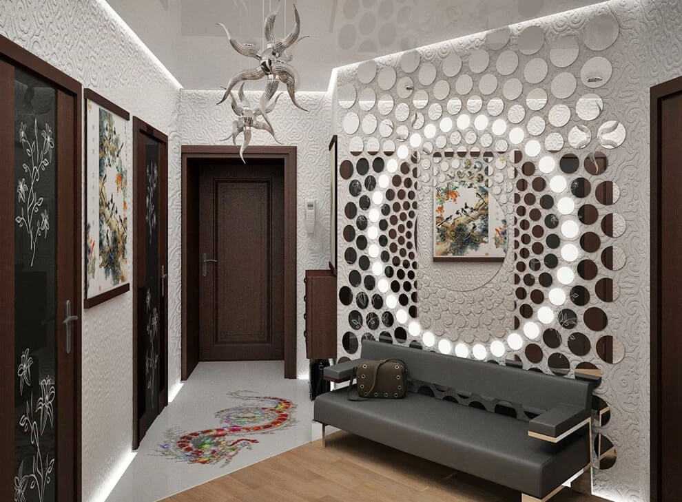 - Маленькую квадратную прихожую нужно оформлять иначе. Здесь отделывают либо одну из стен, смежную двери, либо частично отделать зеркалами две смежные друг другу стены.