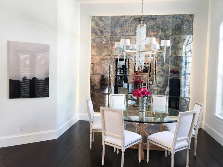 - На кухне лучше не размещать зеркальную поверхность там, где расположена зона готовки. Лучше всего такая стена будет смотреться над обеденным столом. При этом желательно отделать отражающим материалом лишь верхнюю ее часть. В этом случае удасться увеличить пространство помещения, не снизив его практичность. Также можно встретить интерьеры с кухонным фартуком из зеркальной плитки. Такое оформление выглядит очень красиво, однако на такой отделке будут постоянно оставаться разводы и капли воды и жира, которые нужно будет чистить.