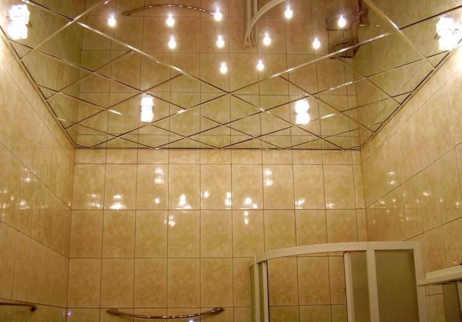 Для ванной комнаты небольшого размера актуален потолок с отражающей поверхностью. Он кажется выше, пространство расширяется