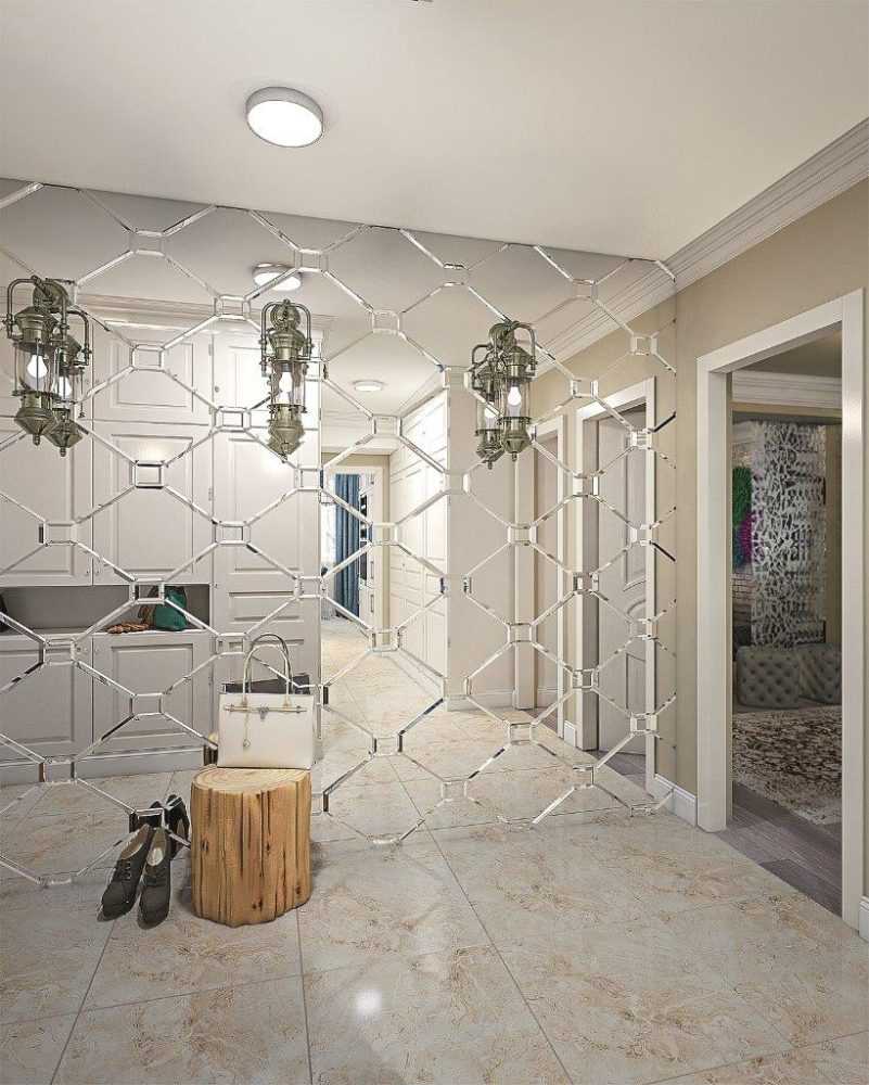 В прихожей. Дизайн прихожей как раз предполагает максимальную площадь зеркальных панелей, пленки или полотна. Но это не значит, что все стены должны быть сплошным зеркалом, на такое решение может специфически среагировать психика. Чтобы не быть визуально дезориентированными в пространстве, многие хозяева выкладывают стену прихожей плиткой.