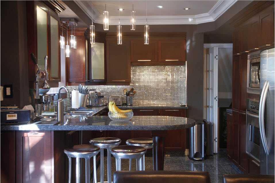 На кухне. В отличие от прихожей, ванной или спальни, в кухне не стоит делать большую стену из зеркальных панелей, пленки или крупной плитки, в фото кухонь чаще встречаются не стена – зеркало, а частичное оформление декоративными элементами. Здесь мы пользуемся опасными предметами, такими, как ножи, либо взаимодействуем с высокими температурами, занимаясь готовкой на плите. При большом размере зеркальной стены может произойти непроизвольная дезориентация в пространстве, и появляется большая вероятность пораниться или обжечься, особенно если панели или крупная плитка находится в поле зрения. В кухне лучше подойдет дизайн, включающий декоративные моменты: панно, наклейку — стикер (она может быть как одна крупная, так и несколько мелких), либо маленькие кусочки плитки – мозаику.