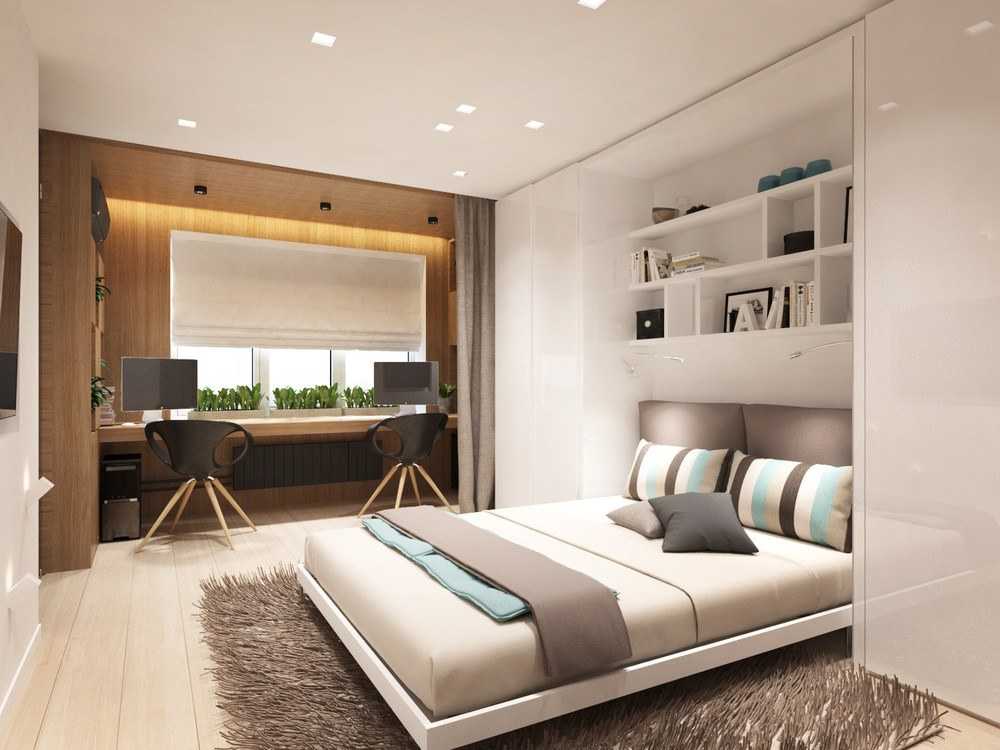 Спальню можно разграничить на место отдыха и зону для работы за компьютером. Как бы мини-кабинет.