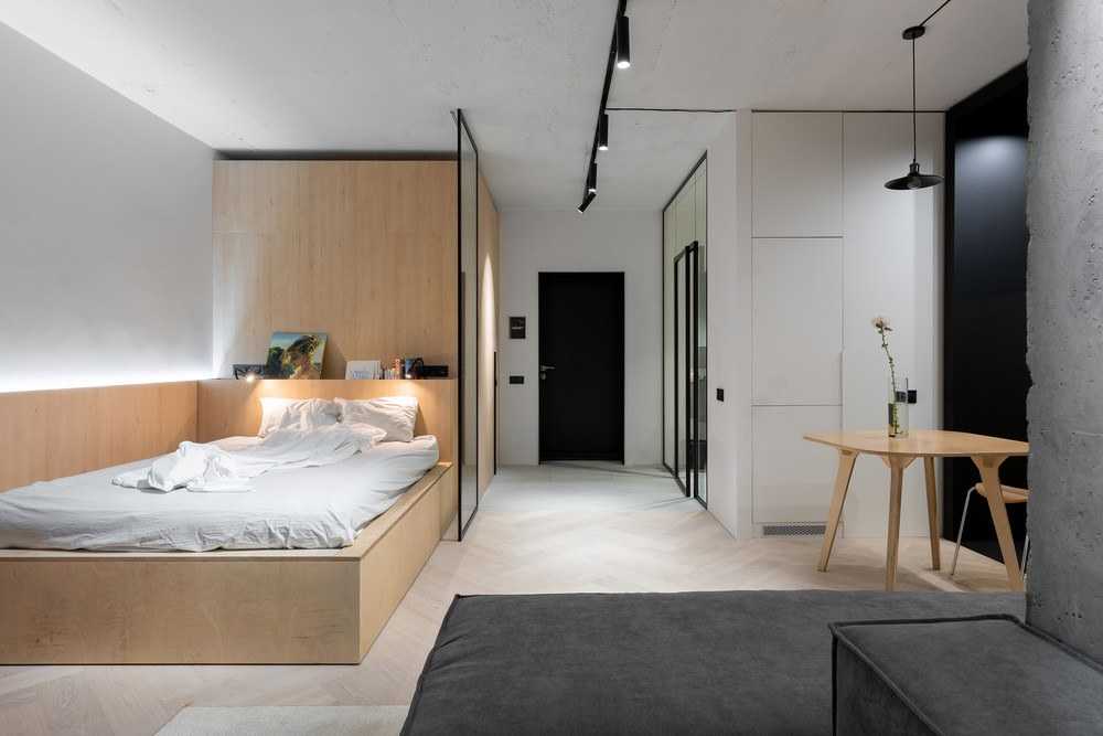 Хотя в квартирах уделяется много внимания открытому пространству, стоит иметь отдельный спальный уголок — тот, который служит ночному отдыху и где нет беспорядка. Это решение не только практично, но и эстетично, так как вам не нужно беспокоиться о неубранной кровати, когда собираете друзей дома. Даже в малогабаритных апартаментах 30-40 м² вы можете отделить небольшое пространство, где можно обустроить спальню. Зона отдыха не должна быть большой, так как достаточно разместить удобную кровать и тумбочку.