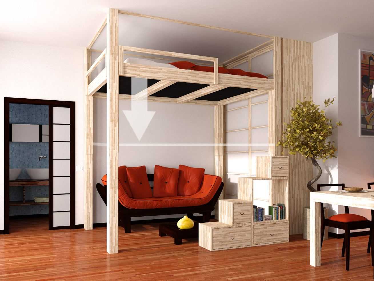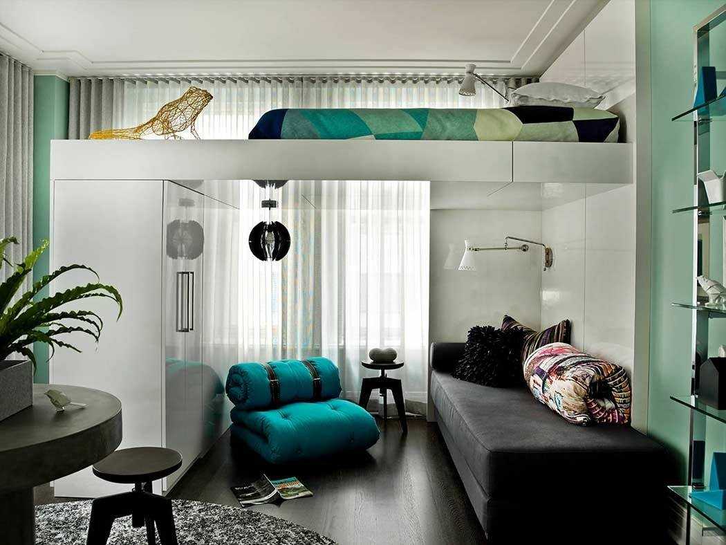 В случае квартир с высокими потолками стоит рассмотреть мезонин. Это идеальное решение, как использовать доступ к потолку, и, таким образом, сохранить полезное пространство студии. Для этой цели вы можете выбрать двухъярусную кровать, верхней частью которой будет ваша спальня, а пространство под ней можно расположить любым способом. Другой способ — построить мезонин и поставить отдельную кровать на временный пол или просто матрас, если комната недостаточно высока. В этом случае, однако, вы должны помнить о правильной балюстраде, которая защитит вас от падения с высоты.