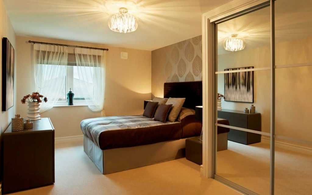 Для хранения вещей лучше заказать шкаф–купе с зеркалами, за счёт которых пространство зрительно увеличится. При этом глубину полок стоит уменьшить хотя бы на 10 см. Такой приём тоже поможет расширить площадь